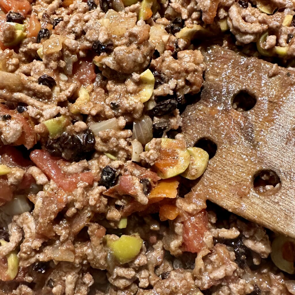 Sauté onion in olive oil over medium heat until translucent. Add ground beef and cook until browned. Add garlic, tomatoes, olives, currants, tomato paste, and spices. Simmer 10 minutes. Set picadillo aside to cool.